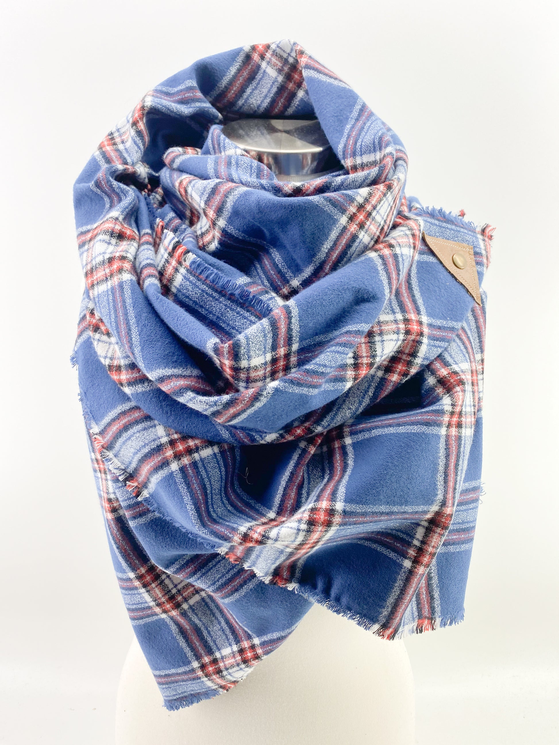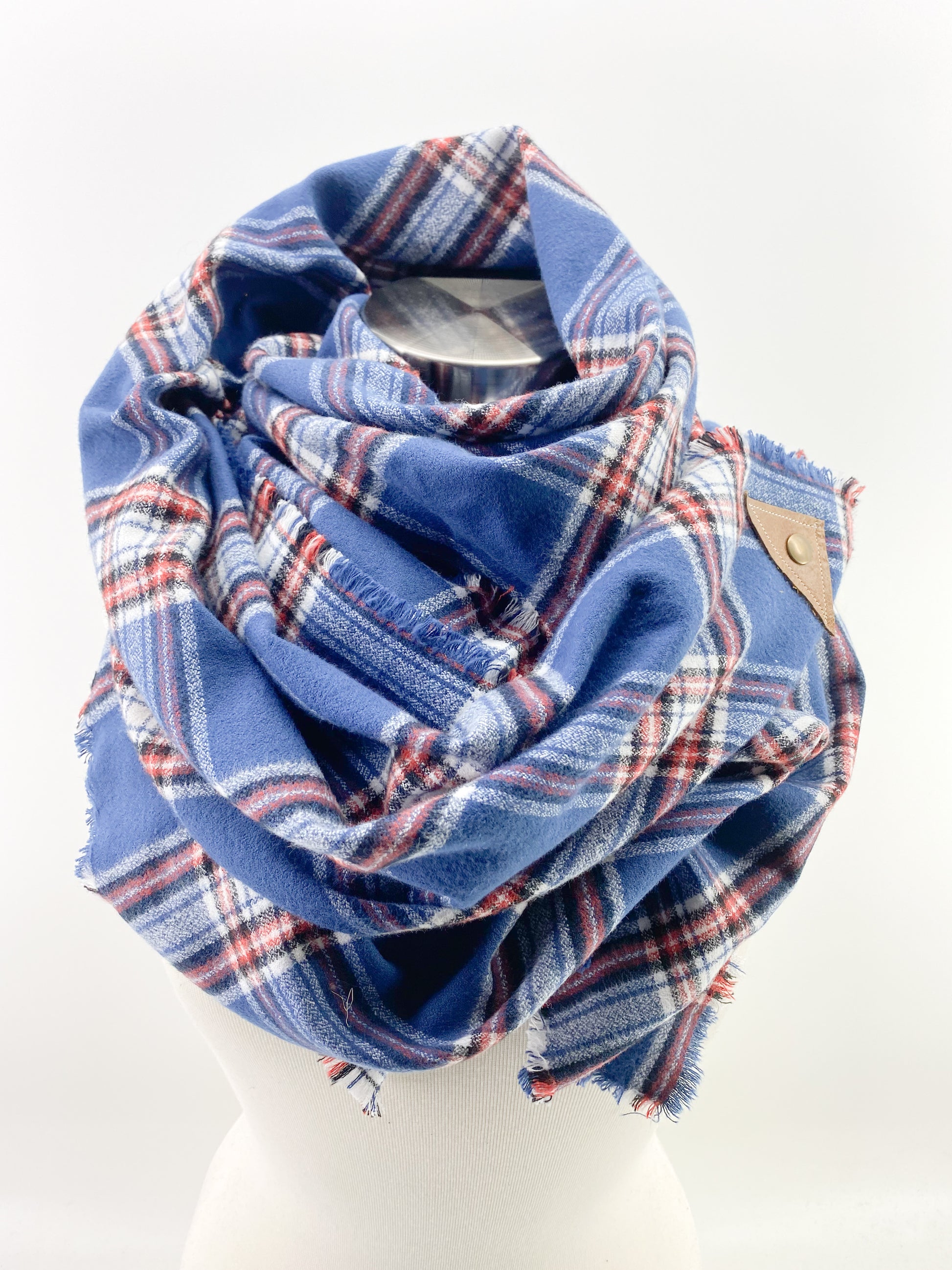 We finish our Blanket Scarves with two leather triangle tabs for added style and function- this scarf can be worn multiple ways, but our favorite is to fold it into a triangle - holding the leather tabs, one in each hand- hold it up to your chest and wrap the ends around your neck and back down in front of you- then snap the snap. Easy and now it stays put!